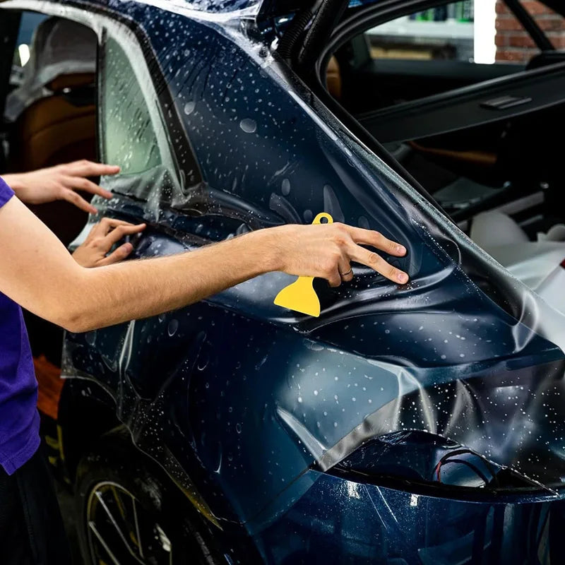Use a squeegee, credit card, or soft cloth to remove bubbles and push out excess water. The film will cling to the glass as it dries.